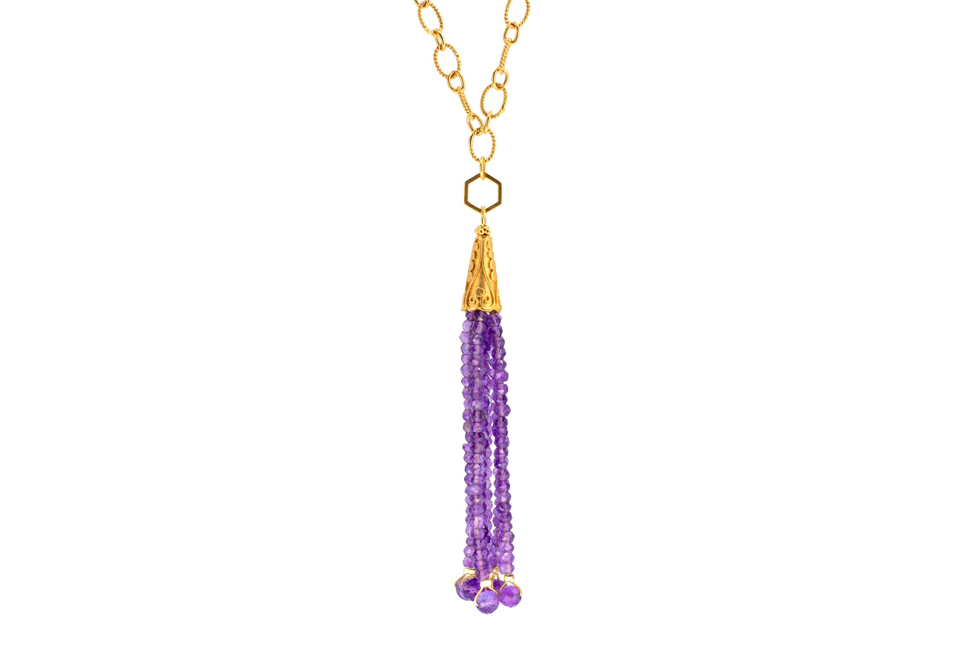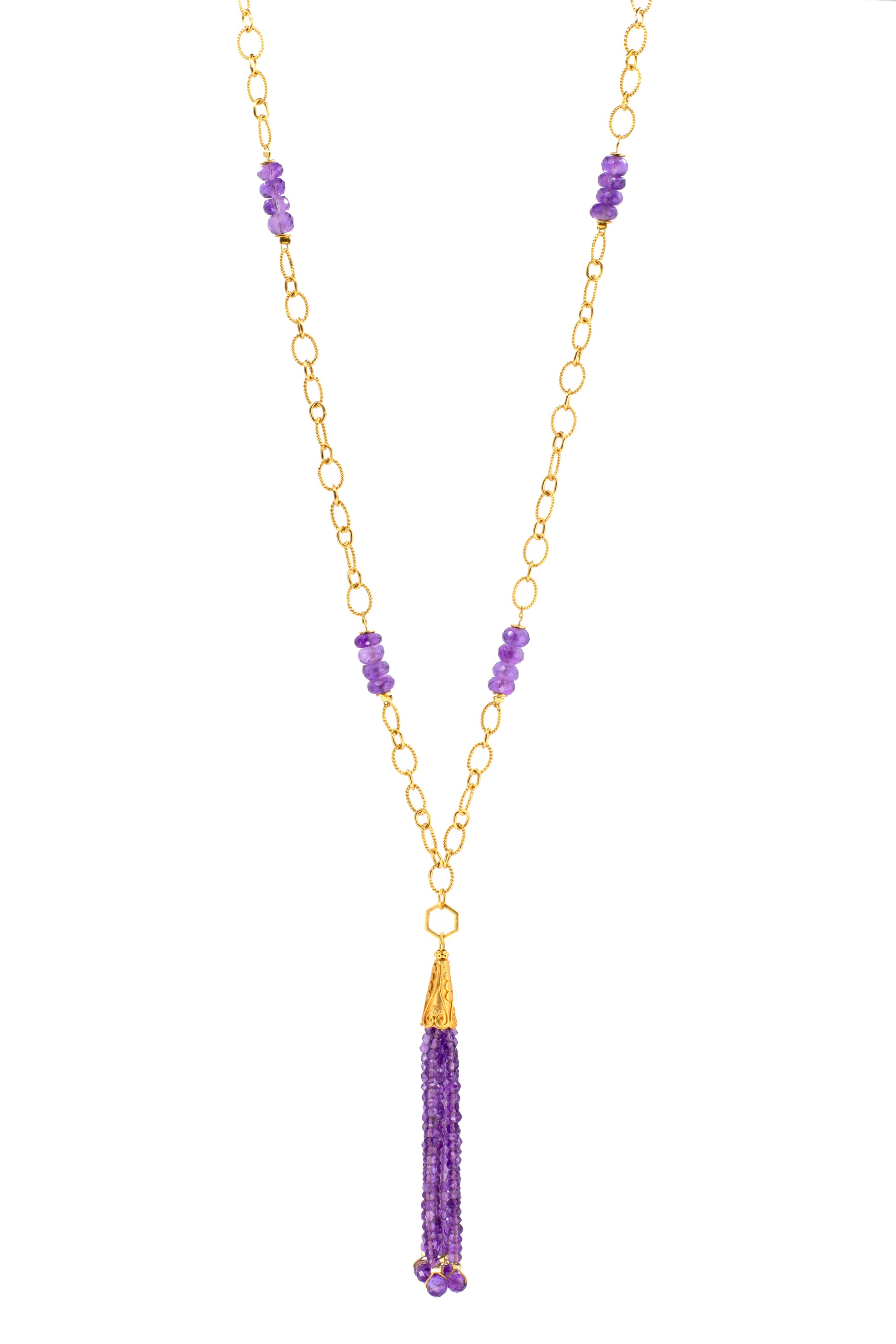 24k vermeil style gold necklace with oval chain, Amethyst spacers and tassel.