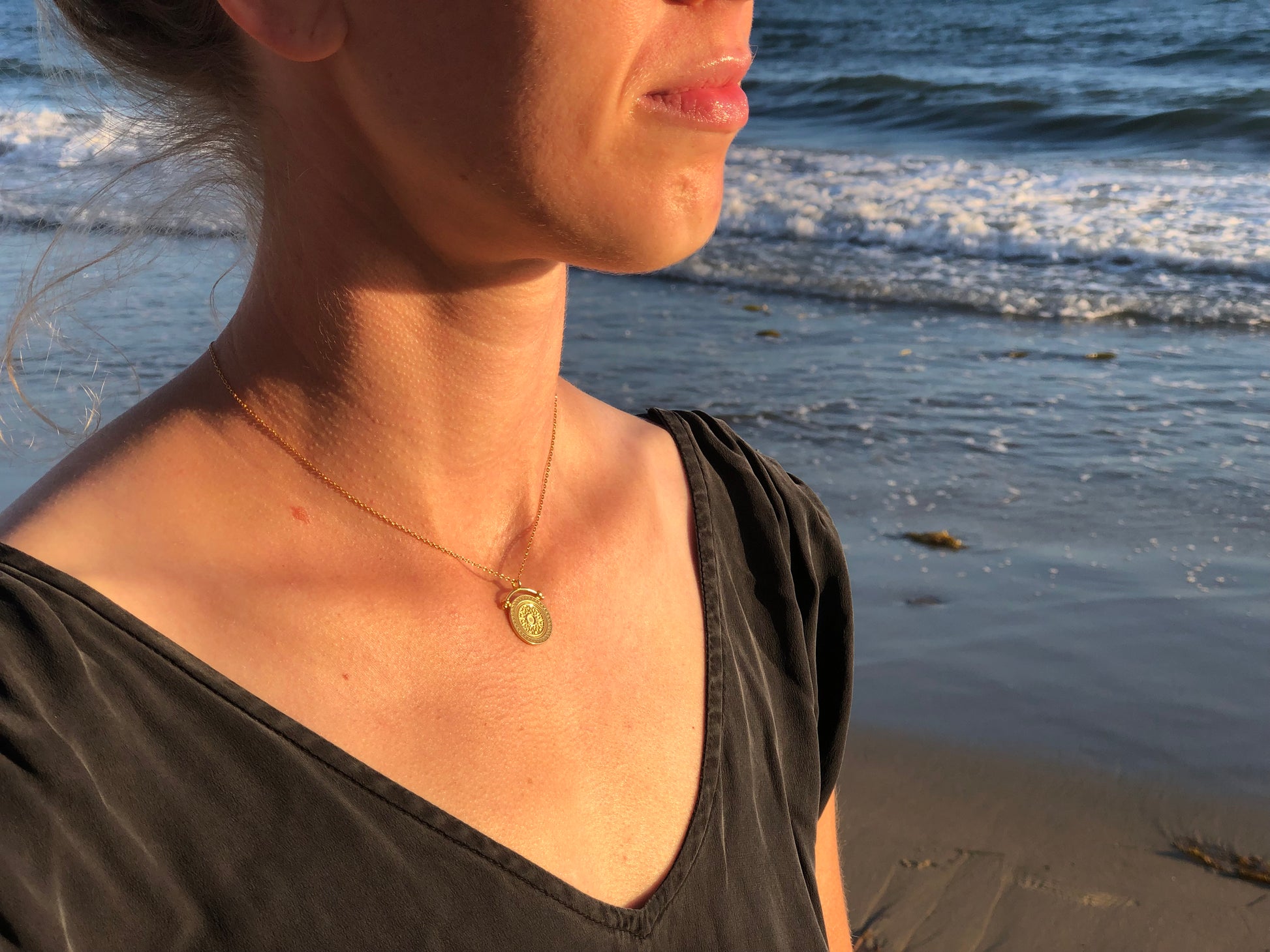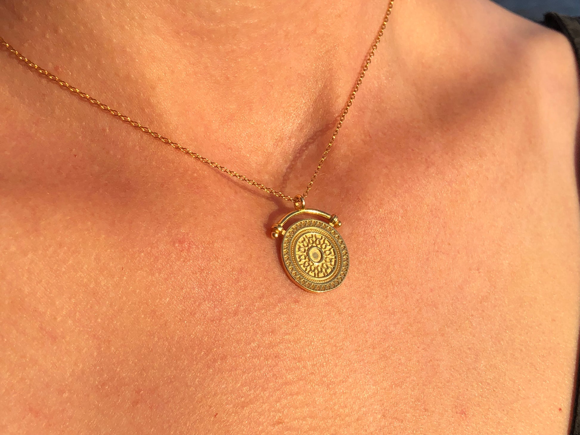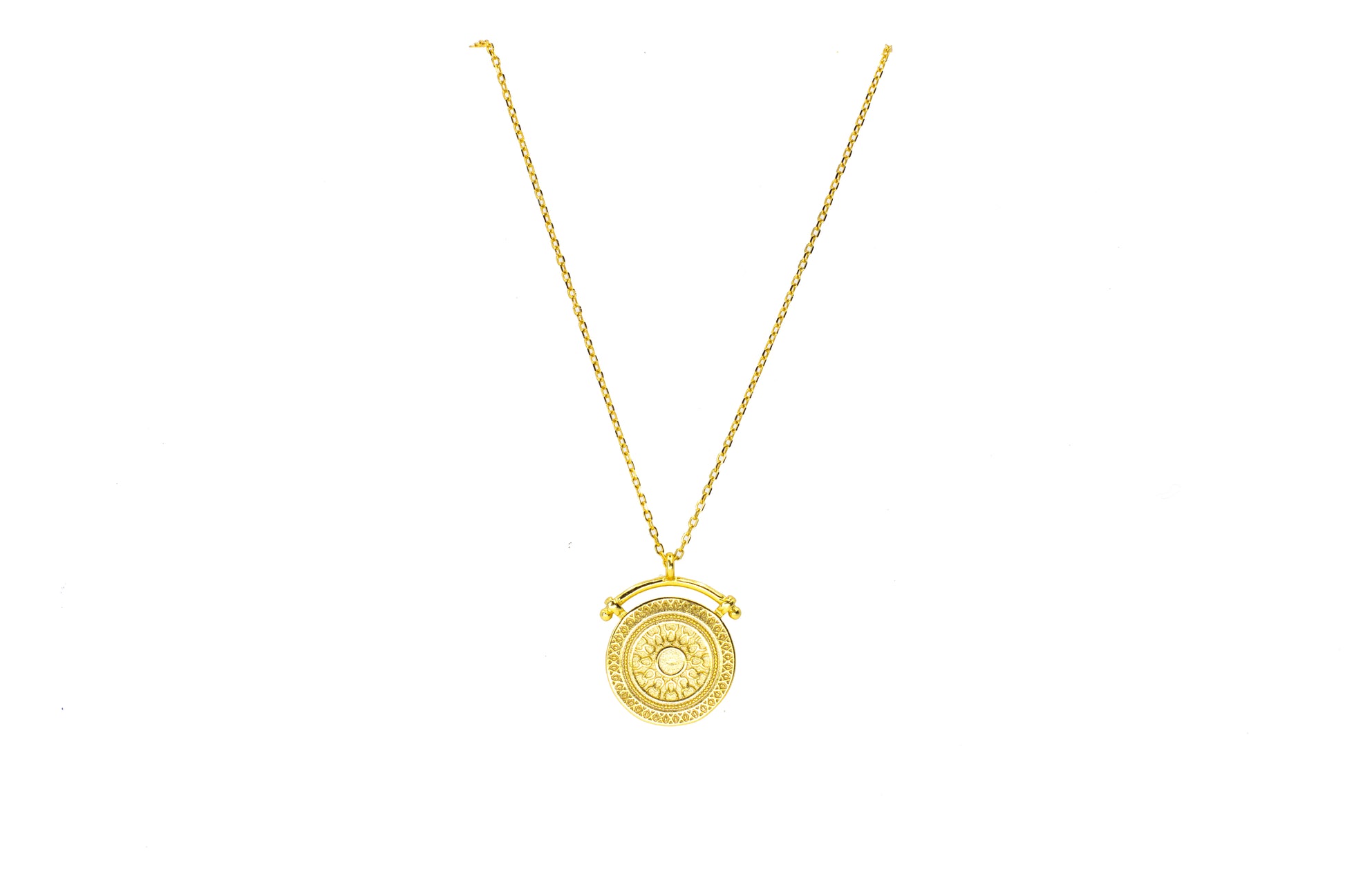 This ornately designed shield pendant has 18k gold plating over sterling silver. Chain included.