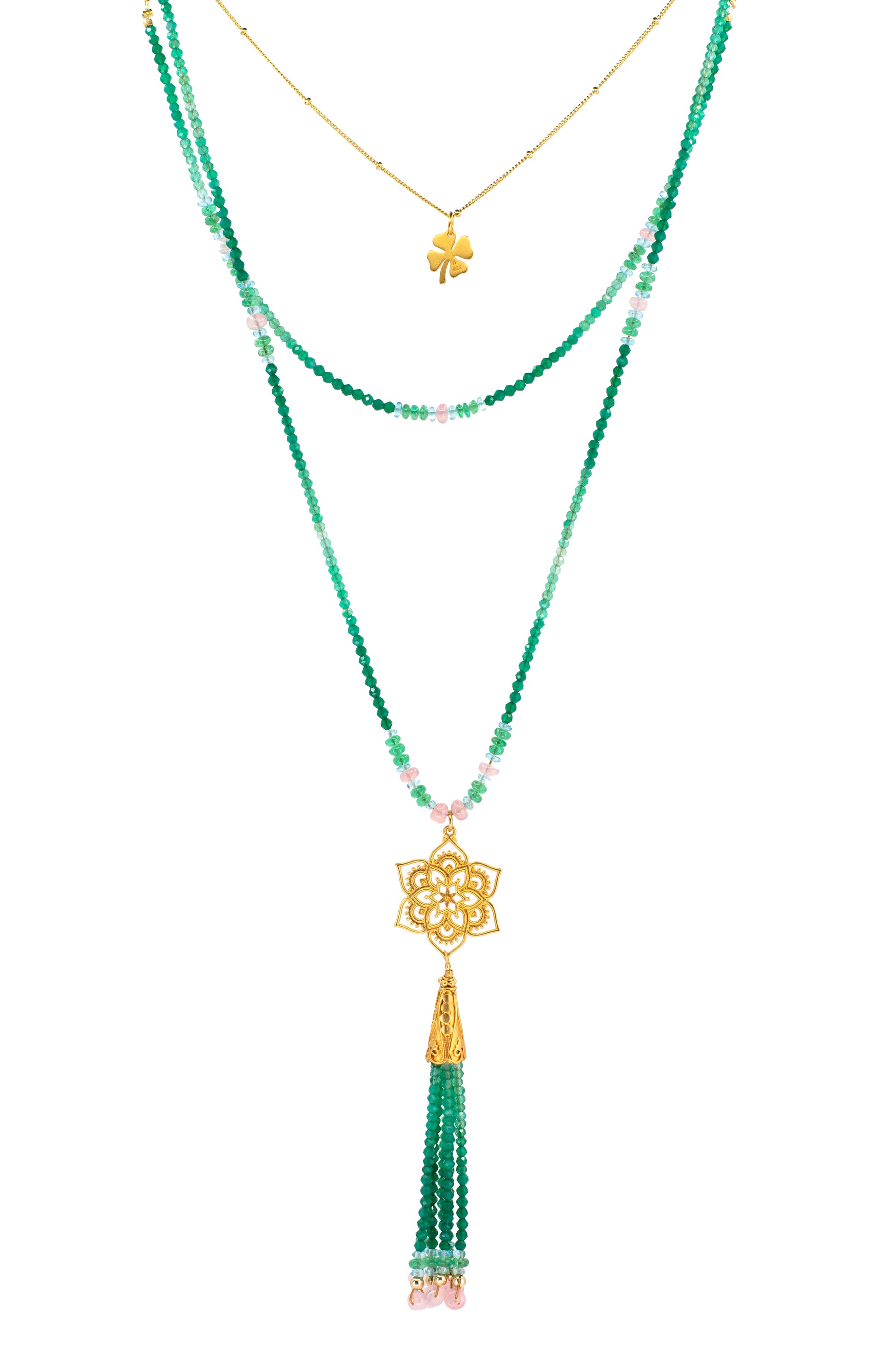 This three piece necklace set is an homage to the beauty of the lotus. A symphony of green onyx, Zambian emeralds, apatite, rubies, and rose quartz contrasts beautifully with the 24k gold vermeil. This fine art is a synergy of ancient and modern jewelry design, giving it a timeless elegance and evergreen charm.