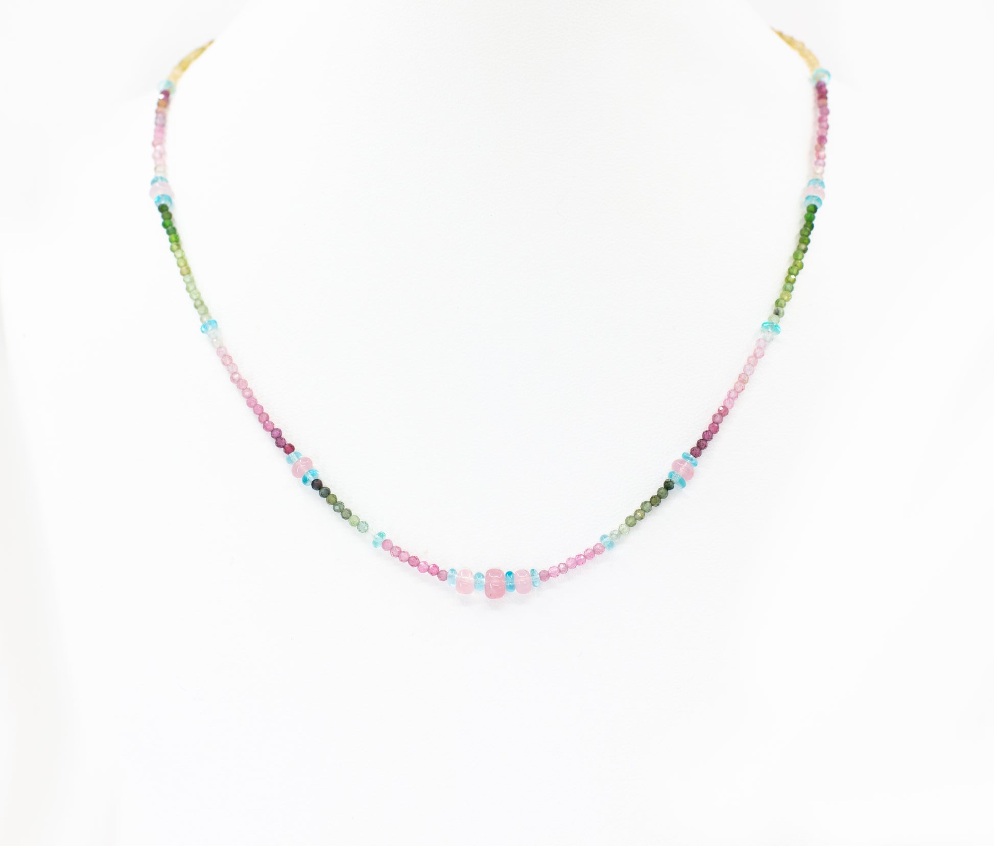 Rainbow tourmaline with apatite and rose quartz accents.
