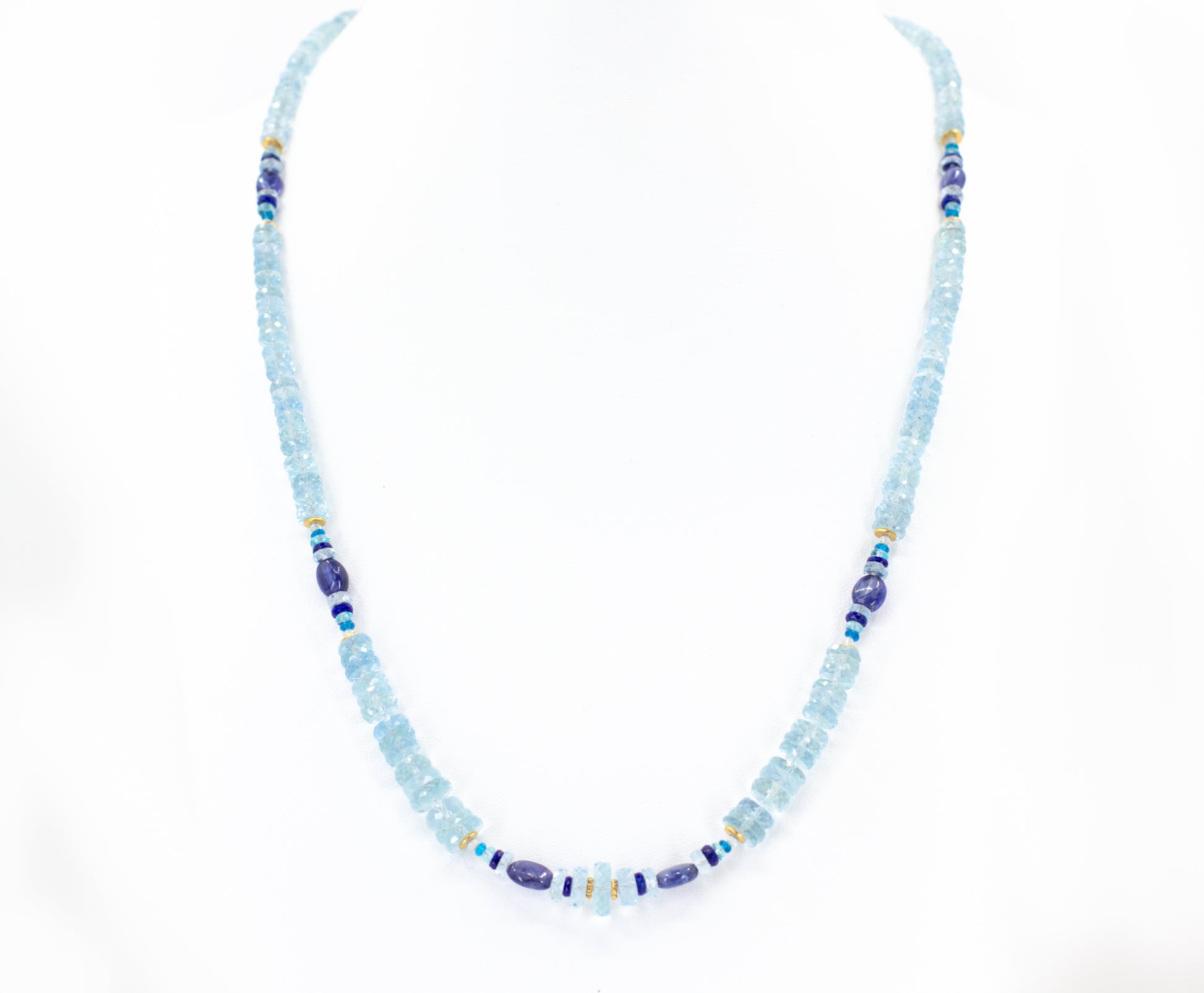 Aquamarine, neon apatite, sky apatite, lapis lazuli, sappire.